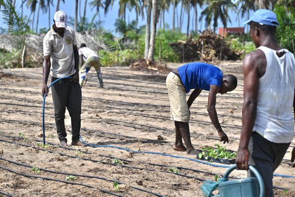Ce projet est le fruit d'une collaboration entre la Coopérative sociale « Cielo d'Irlanda » et l'ONG SoPADA. Financé par la Coopérative, le projet a consisté à installer un jardin potager moderne avec irrigation goutte à goutte sur deux hectares, garantissant des récoltes tout au long de l'année, y compris pendant la saison sèche de novembre à mars. Les deux techniciens, Fausto Guareschi et Davide Bigi, ont pris deux semaines de vacances pour installer le système. Une vingtaine de kilomètres de lignes goutte à goutte sont alimentées par trois puits et leurs motopompes respectives. Le terrain, situé entre l'océan et la lagune de Degué (Ouidah), est principalement sablonneux, mais assez riche. Douze travailleurs forment une coopérative (Copromad). La période d'installation a également été une période de formation. Tandis que certains se consacraient à l'apprentissage de la pose des tuyaux, d'autres préparaient les semis. Nous avons commencé avec différents types de légumes et de fruits afin de déterminer ceux qui étaient les mieux adaptés au sol et au marché local, optimisant ainsi le rapport coûts/revenus. Les cultures que nous avons choisies pour commencer sont : pastèques, melons, tomates, aubergines, oignons, poivrons et divers piments forts. Si les financements arrivent, nous tenterons de remplacer les motopompes par des pompes électriques alimentées par un système photovoltaïque, réduisant ainsi les coûts d'exploitation de l'irrigation à zéro. Nous n'en sommes qu'aux prémices. Les résultats en termes de production sont encourageants. Il en va autrement des revenus, qui pâtissent malheureusement d'un marché trop faible pour garantir la pérennité. À cette fin, nous avons décidé de nous équiper, dès que les ressources le permettront, d'un véhicule à trois roues pour transporter les produits jusqu'à la capitale, Cotonou, où un marché plus prospère pourrait garantir une certaine rentabilité. Pour l'instant, chez SoPADA, nous essayons de superviser les travaux de manière régulière, tandis que « Cielo d'Irlanda » continue de financer partiellement la main-d'œuvre pour encourager les travailleurs à travailler dur pour améliorer la durabilité jusqu'en octobre, date à laquelle la gestion sera entièrement reprise par la coopérative locale COPROMAD.