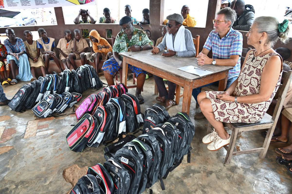 En présence du chef de district, du chef de village, du directeur de l'école AIDO et du président de l'Association pour le développement des villages côtiers de Ouidah, nous avons procédé à la remise des fournitures scolaires dans une ambiance festive, après avoir écouté les remarques des autorités. Malgré une journée plutôt maussade, avec quelques risques de pluie, tout s'est bien déroulé, à la grande satisfaction des enfants et de tous les participants.