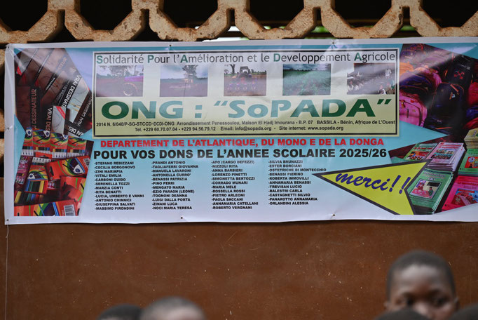 Samedi 16 septembre dernier, un de nos représentants de l'ONG SOPADA, FOUSSENI Djaffarou, s'est rendu à Penessolou, au nord du pays, pour la remise des fournitures scolaires à 39 enfants et jeunes orphelins. Cette année, nous en avons 5 de plus qui sont déjà au collège. Nous accompagnons tous les autres dans leur parcours scolaire depuis 2018. Jusqu'à présent, ils ont répondu à nos attentes, en suivant leurs cours respectifs de manière cohérente, sérieuse et sérénité. Nous n'avons pas pu être présents car nous préparions à notre tour les kits pour les 127 autres élèves orphelins de Ouidah au sud du pays. Plusieurs autorités étaient présentes : le chef et délégué du village de Penessoulou Alidou Djibril représentant du maire, empêché par d'autres engagements, le président de l'Association pour le Développement de Penessoulou, Sanda Aliou, deux conseillers municipaux de la commune chef-lieu de Bassila, Alassane. Abasse et Gouda Moussa, le Président de l'Association des Artisans et représentant des parents d'élèves, Tchiffi Zouliath. La cérémonie s'est déroulée à la Maison des Jeunes de l'arrondissement de Penessoulou dans une ambiance joyeuse. Un chaleureux merci à tous les donateurs italiens qui nous ont aidé avec leurs dons.
