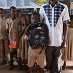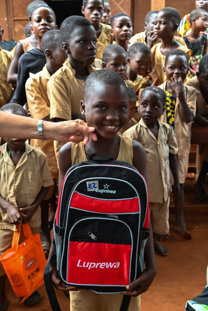À la fin de notre journée, nous voulions lui offrir un petit cadeau : une trousse scolaire complète comprenant un sac à dos, du tissu pour son uniforme et tout le matériel scolaire dont il a besoin pour pouvoir aller à l'école désormais.