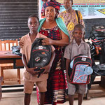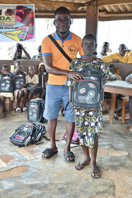avec Aliou et Rafiou, il a pu distribuer 72 kits scolaires dans deux villages différents :
