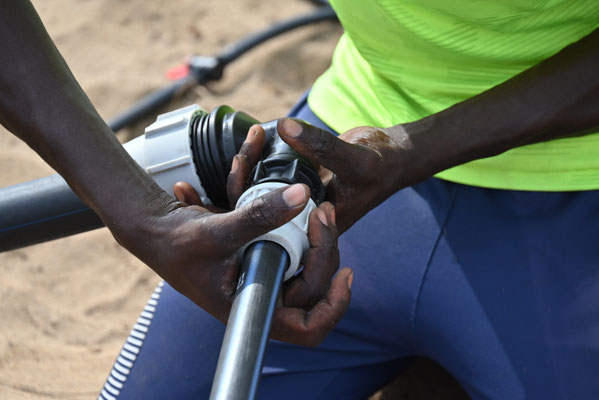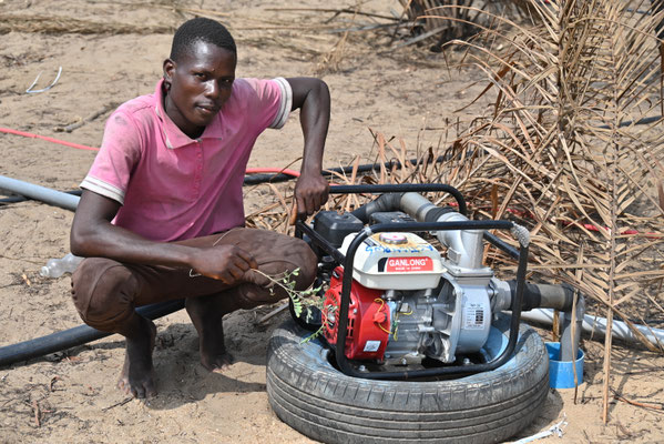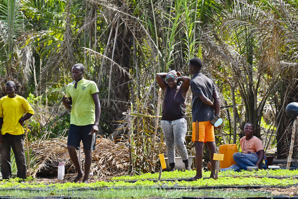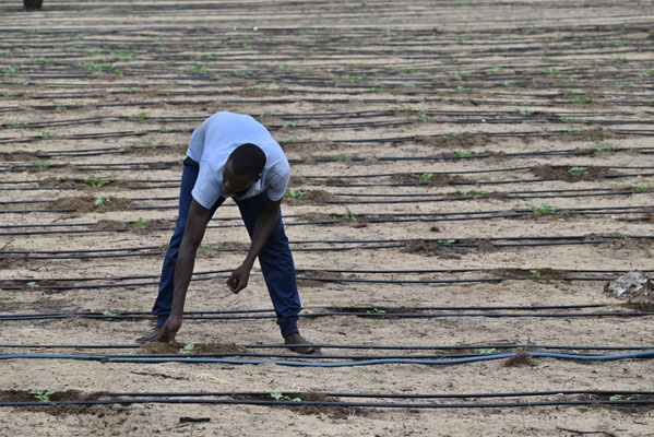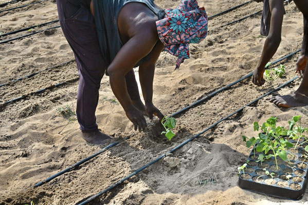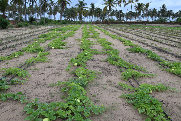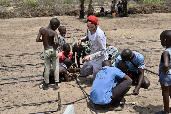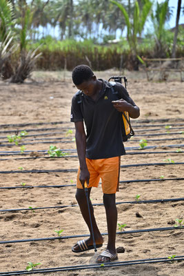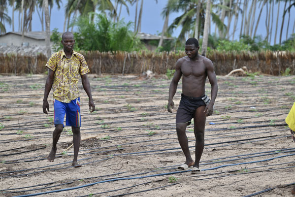 Ce projet est le fruit d'une collaboration entre la Coopérative sociale « Cielo d'Irlanda » et l'ONG SoPADA. Financé par la Coopérative, le projet a consisté à installer un jardin potager moderne avec irrigation goutte à goutte sur deux hectares, garantissant des récoltes tout au long de l'année, y compris pendant la saison sèche de novembre à mars. Les deux techniciens, Fausto Guareschi et Davide Bigi, ont pris deux semaines de vacances pour installer le système. Une vingtaine de kilomètres de lignes goutte à goutte sont alimentées par trois puits et leurs motopompes respectives. Le terrain, situé entre l'océan et la lagune de Degué (Ouidah), est principalement sablonneux, mais assez riche. Douze travailleurs forment une coopérative (Copromad). La période d'installation a également été une période de formation. Tandis que certains se consacraient à l'apprentissage de la pose des tuyaux, d'autres préparaient les semis. Nous avons commencé avec différents types de légumes et de fruits afin de déterminer ceux qui étaient les mieux adaptés au sol et au marché local, optimisant ainsi le rapport coûts/revenus. Les cultures que nous avons choisies pour commencer sont : pastèques, melons, tomates, aubergines, oignons, poivrons et divers piments forts. Si les financements arrivent, nous tenterons de remplacer les motopompes par des pompes électriques alimentées par un système photovoltaïque, réduisant ainsi les coûts d'exploitation de l'irrigation à zéro. Nous n'en sommes qu'aux prémices. Les résultats en termes de production sont encourageants. Il en va autrement des revenus, qui pâtissent malheureusement d'un marché trop faible pour garantir la pérennité. À cette fin, nous avons décidé de nous équiper, dès que les ressources le permettront, d'un véhicule à trois roues pour transporter les produits jusqu'à la capitale, Cotonou, où un marché plus prospère pourrait garantir une certaine rentabilité. Pour l'instant, chez SoPADA, nous essayons de superviser les travaux de manière régulière, tandis que « Cielo d'Irlanda » continue de financer partiellement la main-d'œuvre pour encourager les travailleurs à travailler dur pour améliorer la durabilité jusqu'en octobre, date à laquelle la gestion sera entièrement reprise par la coopérative locale COPROMAD.