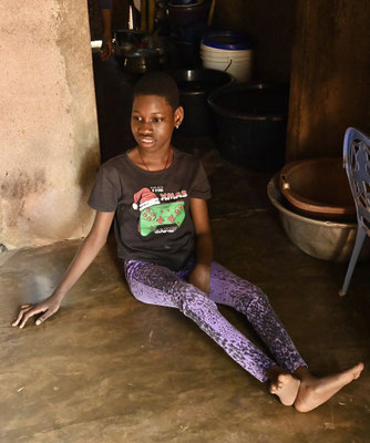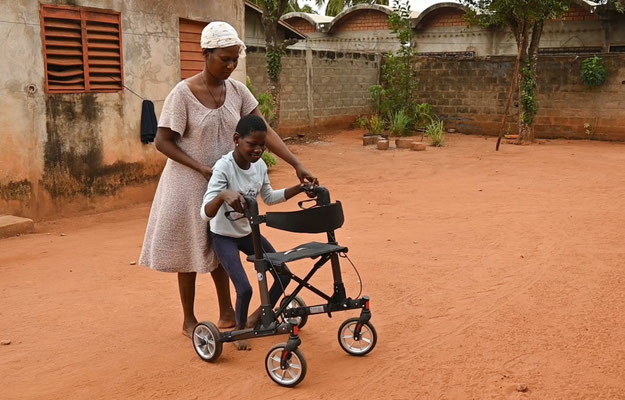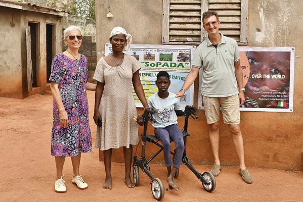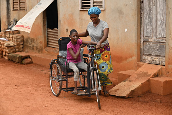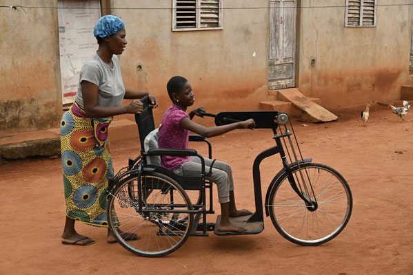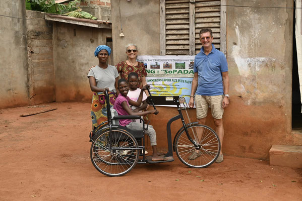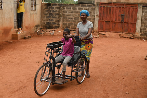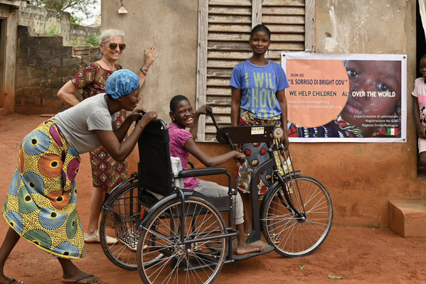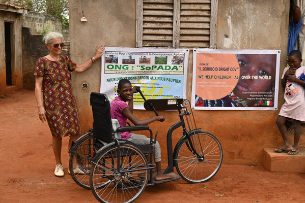 Une fois le tricycle monté et testé, nous l'avons emmené chez Chancelle qui, comme d'habitude, nous a accueillis avec un enthousiasme touchant. Elle n'a pas voulu perdre de temps et a immédiatement pris le volant. Ses bras fonctionnent bien mieux que ses jambes. Il va devoir se muscler pour pousser le véhicule. Pour l'instant, il semble bien se débrouiller tant que le chemin est droit. Il a beaucoup de difficultés dans les virages. Nous avons déjà observé cette phase lors de dons d'autres tricycles. Puis, il s'en remet généralement. Nous avons obtenu un premier résultat : il a retrouvé le sourire et peut-être retrouvé l'envie de réussir. Une sorte de tournant dans sa vie, marquant un nouvel espoir. Mais ce sourire, expression ultime de gratitude, n'est pas seulement celui de Chancelle, mais aussi celui de sa mère, très découragée car, malgré toute sa volonté et son dévouement, elle n'aurait pas pu faire la différence, faute de ressources. Merci aux donateurs italiens, à l'ONG « IL SORRISO DI BRIGHT » et aux bénévoles sur place qui nous aident à atteindre ces résultats modestes, mais importants.