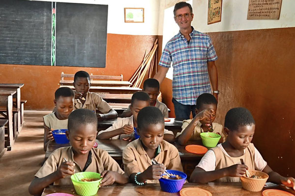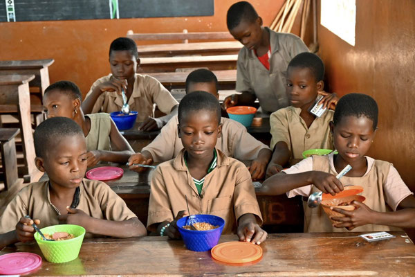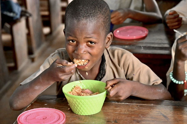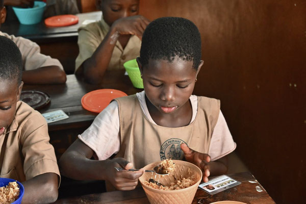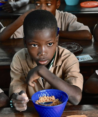 Penser résoudre le problème de la scolarisation des enfants pauvres uniquement avec des fournitures scolaires est trompeur. C'est vrai que nous ne pouvons pas résoudre tous les problèmes seuls, mais dans le cas de Fonsramé et Agbanu, tandis qu'un enseignant lisait la lettre de remerciement lors de la cérémonie de passation de pouvoir, nous nous sommes demandés si nous avions vraiment fait tout notre possible pour eux. Au cours de ces remerciements officiels, il a été souligné que les enfants qui disposent aujourd'hui de tout ce dont ils ont besoin pour un apprentissage correct sont très attentifs, curieux et avides d'apprendre. Sans leurs livres et cahiers, ils étaient considérés par tous comme une nuisance et avaient également une attitude indisciplinée. Il suffit de peu pour faire ressortir les qualités de ces enfants : il leur suffit de disposer des outils pour apprendre et la métamorphose s'opère immédiatement. Mais ce qui nous a le plus touché, c'est quand ils nous ont dit que certains d'entre eux n'avaient même pas les 150 F. (0,25 €) par jour pour manger pendant la récréation. Tandis que tout le monde se dirige vers les vendeurs pour prendre son déjeuner, ils errent inconsolables parmi les pupitres de l'école, un peu à l'écart par honte et attendant avec impatience la reprise des cours pour retrouver les autres sans distinction. Mais certains ont le ventre plein, d'autres n'ont peut-être même pas pris de petit-déjeuner avant d'aller à l'école. À la satisfaction d'avoir réussi à fournir du matériel scolaire s'ajoutait le goût amer de ne pas avoir pu, à l'époque, garantir un repas quotidien à ceux qui en avaient vraiment besoin. Puis la Providence – qui a toujours un prénom et un nom – est arrivée ! Nous avons donc agi pour identifier, grâce à une enquête minutieuse, les enfants qui ne sont pas en mesure de manger le minimum quotidien, nous avons pris contact avec les cuisiniers vendeurs et avons établi avec eux un contrat pour la fourniture de repas pour 28 enfants jusqu'à à la fin de l'année scolaire. Prépaiement chaque début de mois. Chaque enfant dispose de son propre bol avec couvercle et cuillère et d'un badge personnel avec photo qui permet aux vendeurs de le reconnaître et de lui fournir le repas. Les ingrédients sont convenus et variés pour garantir une alimentation équilibrée à base de riz, pâtes, sauce tomate/oignon et poisson. Alternativement, polenta, sauce à la tomate et au piment, haricots et viande.