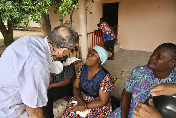 Jusqu'à la dernière minute, nous ignorions si nous serions autorisés à organiser, comme nous le faisons habituellement, des consultations dentaires pour les personnes les plus démunies de la commune de Ouidah. La clinique le Siloé de Pahou nous avait déjà promis l'hospitalité. Il ne manquait plus que l'approbation du médecin-chef local, qui représente le ministère de la Santé. Cette approbation est arrivée deux jours seulement avant le début des consultations. Le Dr Guido, en voyage du Ghana au Bénin, est arrivé la veille après-midi, juste à temps pour installer la clinique. C'est un peu petit, mais nous parvenons à y installer un petit lit, un vieux lit d'hôpital légèrement rouillé, et quelques tables pour poser pinces, sondes, désinfectants, médicaments, etc. Au milieu de la pièce, une chaise robuste sur laquelle nous installons la mini-unité dentaire portable qui abrite turbines, aspirateurs, détartreurs, etc. La clinique est prête pour le lendemain. Tôt le matin, quelques patients étaient déjà là. De rapides consultations ont eu lieu sous la véranda qui sert de salle d'attente. Guido commence à avoir un peu le vertige. Il faut vérifier sa tension. Elle est un peu basse, mais elle s'améliore, et c'est un bon départ. Comme souvent, les personnes démunies accumulent les problèmes au fil des ans, faute de ressources, et ont souvent deux ou trois dents à extraire, ou ce qu'il en reste. Une intervention chirurgicale est souvent nécessaire pour extraire les racines ossifiées. Malgré une gêne lancinante, Guido parvient à mener à bien chaque cas. Nous travaillons debout et avec une bonne dose de tension. Nous prenons une pause déjeuner rapide et locale : baguette avec salami italien artisanal. L'arrivée de nouveaux patients nous oblige à raccourcir la pause, qui ne dure pas plus de 20 minutes. Nous recommençons. Les cas faciles alternent avec les plus compliqués, mais nous arrivons au soir sans problème majeur. Le seul problème, c'est notre fatigue incommensurable ! Nous donnons à chaque patient les médicaments post-extraction nécessaires, ainsi qu'un petit médaillon représentant la Madone (Guido en a rapporté des centaines d'Italie), que tout le monde semble apprécier ; certains en demandent même deux ou trois ! Heureusement, le lendemain, c'est la mi-août, alors nous nous reposons avant de reprendre le lendemain. Même constat : dès notre arrivée au cabinet, Guido ressent un vertige, qui passe assez vite. Nous recommençons comme l'autre jour. L'afflux de patients nous a contraints d'en reporter un certain nombre à l'après-midi. Au bout de deux jours, nous avons répondu aux besoins de 50 à 60 personnes, la plupart souffrant de douleurs intenses dues à de larges caries. Nous sommes tous très fatigués. Guido s'allonge un instant sur le grand lit et s'endort instantanément. On dirait qu'il est mort. Nous lui déposons un chapelet dans les mains et prenons une photo de son corps ! Malgré l'épuisement, l'envie de plaisanter nous habite encore ! Comme chaque année, l'expérience nous enrichit toujours un peu plus intérieurement. Savoir que nous pouvons soulager la souffrance, même physique, nous pousse à remercier le bon Dieu de nous avoir permis d'être ses instruments. Ces personnes sans ressources n'auraient plus jamais pu sourire. Leur gratitude nous comble de joie. Nous quittons le Dr Badou, directeur médical de la clinique, avec la promesse que l'année prochaine nous ferons tout notre possible pour renouveler l'expérience.