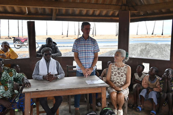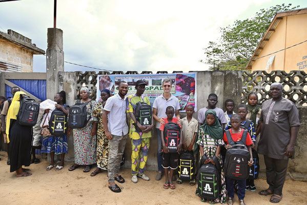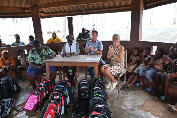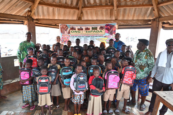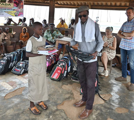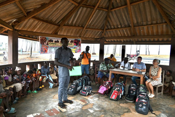 En présence du chef de district, du chef de village, du directeur de l'école AIDO et du président de l'Association pour le développement des villages côtiers de Ouidah, nous avons procédé à la remise des fournitures scolaires dans une ambiance festive, après avoir écouté les remarques des autorités. Malgré une journée plutôt maussade, avec quelques risques de pluie, tout s'est bien déroulé, à la grande satisfaction des enfants et de tous les participants.