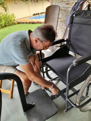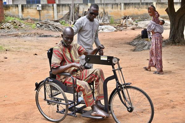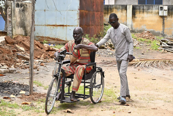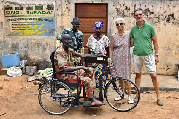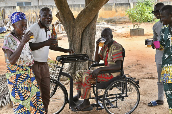 Nous ne pouvions pas rester indifférents à cette tragédie, qu'il acceptait peut-être comme inévitable. Aussi, après avoir confirmé que ses bras étaient en bonne santé, nous avons décidé de lui faire don d'un tricycle à propulsion manuelle. Aussitôt dit, aussitôt fait ! Nous en avons acheté un à Cotonou mercredi ; Je l'ai assemblé hier et nous l'avons livré aujourd'hui à son domicile. Il s'appelle Zonon Avocere. Il dit avoir environ soixante-dix ans, mais la tolérance ici est d'environ dix ans. Il est mince et d'apparence jeune. Il vit avec sa mère, encore en forme, dans la maison familiale. De nombreux membres de sa famille étaient présents et l'ont immédiatement aidé à découvrir son nouveau véhicule dans une atmosphère de joie palpable. Mais ce qui a été le plus émouvant, c'est sa satisfaction immédiate de savoir qu'il pourra se déplacer seul et dignement sur ce véhicule, qui semble aujourd'hui un peu difficile à manœuvrer, mais qui deviendra bientôt une extension de son corps.