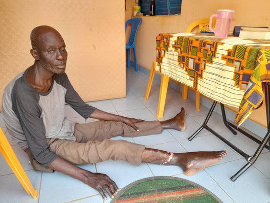 Il y a quelques jours, un homme a traversé la rue en rampant devant le restaurant de notre ONG. Personne ne savait qui il était, mais nous avons appris plus tard qu'il habitait juste à côté. Des rumeurs circulaient et nous ont appris qu'il avait été renversé il y a un an par un motocycliste qui ne s'était pas arrêté pour lui porter secours. Il en a souffert de graves conséquences : fractures ouvertes du tibia et du péroné, et plusieurs ecchymoses sur tout le corps. Faute de moyens pour pratiquer une chirurgie reconstructive, il a soigné les ecchymoses et a laissé les fractures. Son tibia est toujours délogé. Il est probablement déjà calcifié. Il ne peut plus se tenir debout et passe toute la journée assis chez lui sur une natte. Lorsqu'il sort de chez lui, il rampe à l'aide de ses bras.