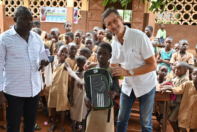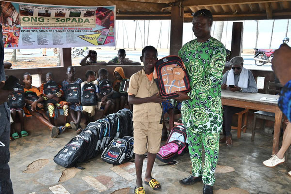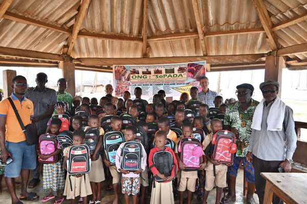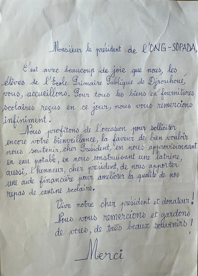 Merci à tous ceux qui ont collaboré avec nous, en particulier Ramos Voudonon, Ibrahim Abou et notre ami Djaffarou, qui ont distribué une centaine de kits scolaires dans la région de la Donga. Je documenterai les résultats dès que je recevrai des contributions écrites et photographiques.