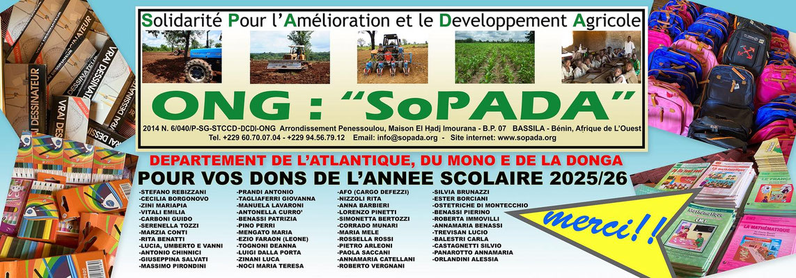 Cette année également, l'ONG SoPADA (Organisation Non Gouvernementale) - qui opère au BÉNIN - a demandé au Dr Corradi de reprendre son activité de volontariat dentaire dans deux Dispensaires de Santé, dont un au sud du pays - à OUIDAH - géré par des Sœurs. de la Congrégation africaine « Notre Dame des Apôtres » – et un au centre-nord du Bénin, à PENESSOULOU, dans la commune de BASSILA, un petit hôpital rural géré par l'État. L'entreprise d'agriculture durable (Solidarité Pour l'Amélioration et le Développement Agricole) est également basée à Penessoulou, qui a également donné son nom à l'ONG qui mène des activités sociales et humanitaires.