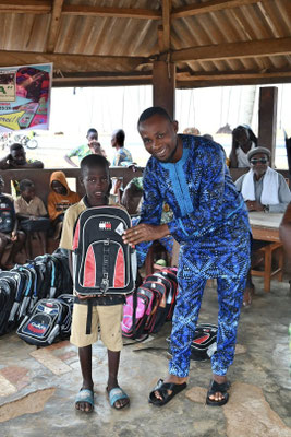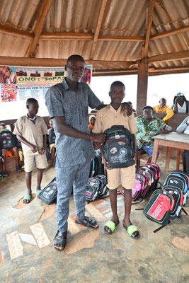 Sul luogo abbiamo mandato Djaffarou che è anche il nostro tesoriere. In un weekend, insieme ad Aliou e Rafiou, ha potuto distribuire 72 kit scolastici in due villaggi diversi: