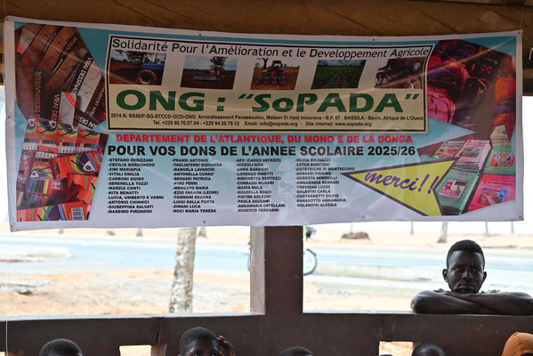 Grazie di cuore oltre che ai donatori, tutti elencati nello striscione che compare nelle foto, a Ramos Vodounon, Koudoda Elisée Barboza, Ibrahim Abou come sempre fedelissimi e importantissimi collaboratori della nostra ONG, che col loro volontariato sollevano enormemente me e Paola da un impegno che facciamo sempre più fatiche a svolgere da soli soprattutto perché l’attività si allarga, grazie a Dio, di anno in anno.
